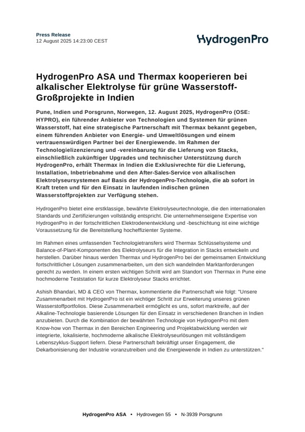 Pune, Indien und Porsgrunn, Norwegen, 12. August 2025, HydrogenPro (OSE: HYPRO), ein führender Anbieter von Technologien und Systemen für grünen Wasserstoff, hat eine strategische Partnerschaft mit Thermax bekannt gegeben, einem führenden Anbieter von Energie- und Umweltlösungen und einem vertrauenswürdigen Partner bei der Energiewende. Im Rahmen der Technologielizenzierung und -vereinbarung für die Lieferung von Stacks, einschließlich zukünftiger Upgrades und technischer Unterstützung durch HydrogenPro, erhält Thermax in Indien die Exklusivrechte für die Lieferung, Installation, Inbetriebnahme und den After-Sales-Service von alkalischen Elektrolyseursystemen auf Basis der HydrogenPro-Technologie, die ab sofort in Kraft treten und für den Einsatz in laufenden indischen grünen Wasserstoffprojekten zur Verfügung stehen.