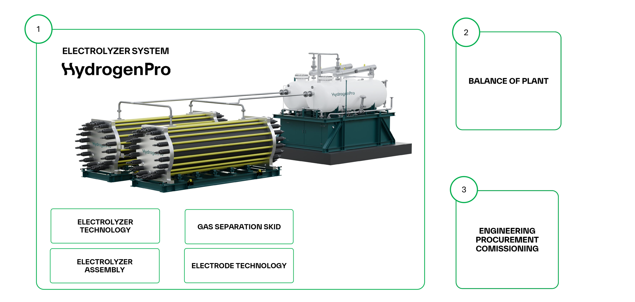 HydrogenPro delivers the heart of green hydrogen projects — including the key components such as the electrolyzer, the electrode technology and the gas separation skid, as well as system assembly. Our partners complement this by managing engineering, procurement, and construction to provide customers with a fully integrated, end-to-end solutions.